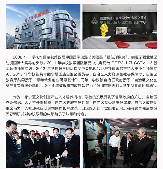 寧夏盛天彩職業(yè)技能培訓(xùn)學(xué)校是經(jīng)自治區(qū)人力資源與社會保障廳審核批準(zhǔn)的寧夏地區(qū)成立最早、教學(xué)規(guī)模最大設(shè)置課程最全面、專業(yè)性最強(qiáng)的數(shù)字藝術(shù)培訓(xùn)機(jī)構(gòu),是銀川市政府重點扶持的動畫教育實訓(xùn)基地,寧夏文化創(chuàng)意產(chǎn)業(yè)基地指定人才培養(yǎng)中心,也是西北地區(qū)唯一接受中央電視臺專訪的高技能人才培育機(jī)構(gòu)。